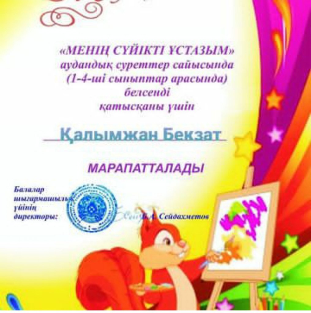 «Менің сүйікті ұстазым» аудандық суреттер сайысында (1-4-ші сыныптар арасында) белсенді қатысқаны үшін Қалымжан Бекзат марапатталады