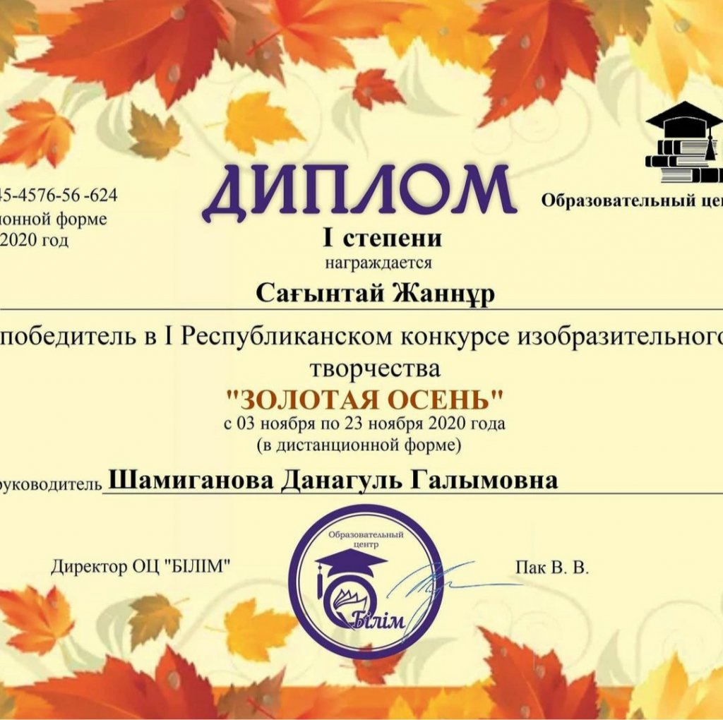Диплом Сағынтай Жаннұр "Алтын күз" І Республикалық өнертапқыштық шығармашылық конкурсында жеңімпаз болып марапатталады"