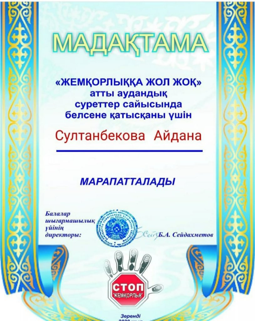 Жемқорлыққа жол жоқ"атты аудандық суреттер сайысында белсене қатысқаны үшін Султанбекова Айдана марапатталады