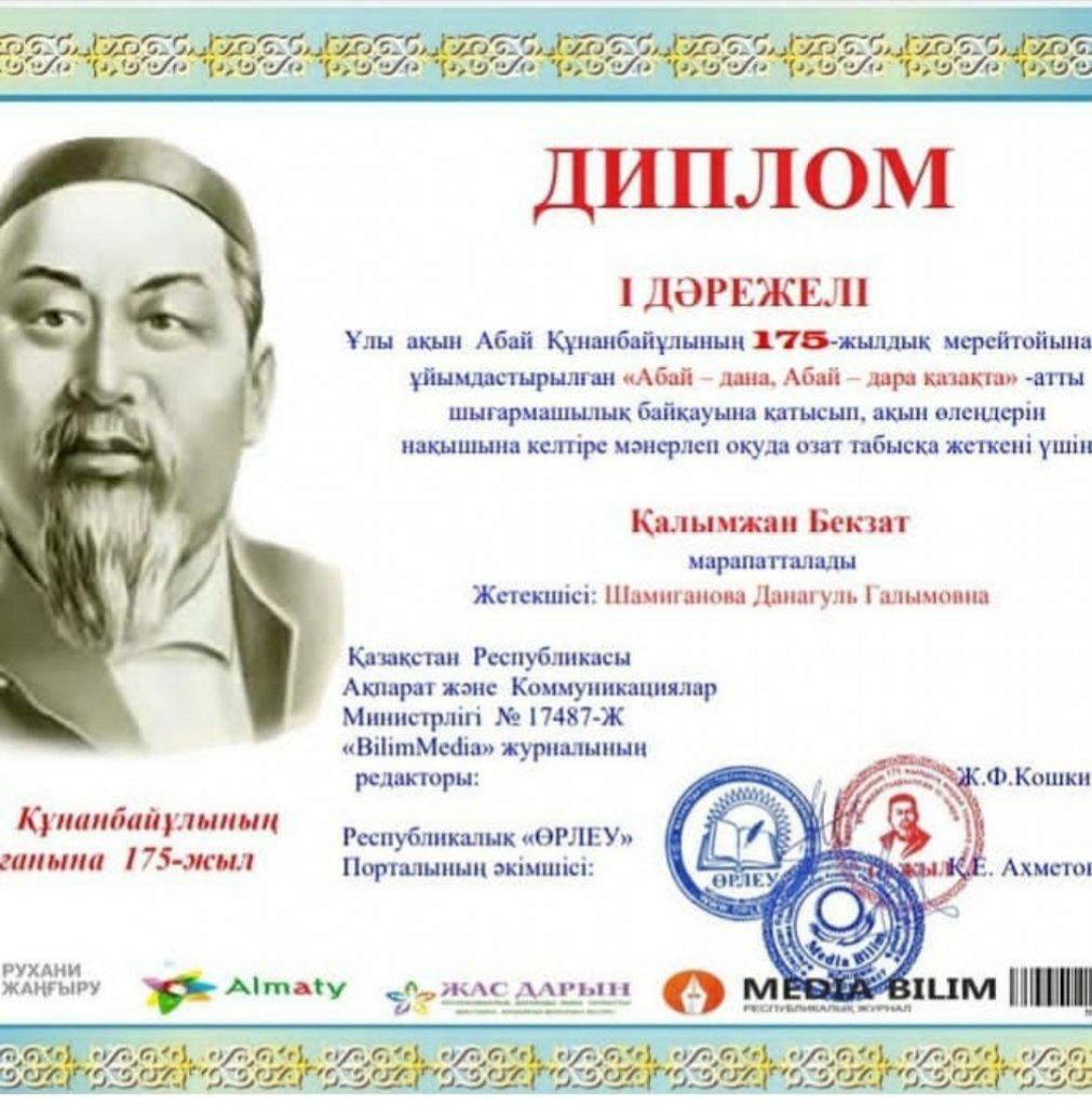 Ұлы ақын Абай Құнанбайұлының 175 жылдық мерейтойына ұйымдастырылған "Абай-дана, Абай -дара қазақта" атты шығармашылық байқауына қатысып, мәнерлеп өлең оқуда озат табысқа жеткені үшін Болат Диас Ардақұлы марапатталады